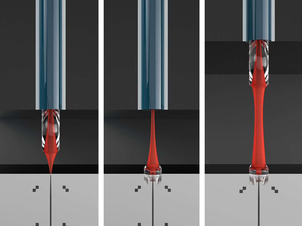 高性能的3D打印机Quantum X align是为加工可自动对准到标定位置并应用于FSMOC的自由曲面微光学器件而设计。设备的自动纤芯检测系统和自动倾斜校正功能保证了在打印到光子芯片、光纤切割端面或V型槽光纤阵列时的纳米级精度对准和最高的形状精度。与传统的透镜或锥形光纤相比,3D打印的微光学器件有以下几点优势:1)对自由曲面微透镜的设计参数的完全控制可以使非球面和非对称设计能纠正各种像差;2)自由定制的光束轮廓可以匹配几乎任何耦合应用。