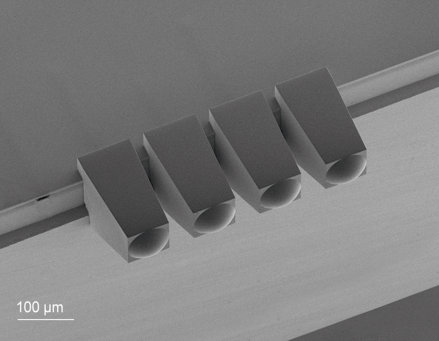 Printing onto a chip’s facet from the top, i.e. perpendicular to the substrate surface, is a challenging task. It requires a precise positioning system and printing solutions to overcome the “shadowing effect”: This effect occurs because a substantial part of the intensity in the focal point of the printing laser is lost when printing onto a facet. This is due to the light being partly blocked by the edge of the substrate. The shadowing effect is more prominent near the substrate wall, which requires higher exposure doses. The A2PL® nanofabrication system automatically compensates for this effect using a proprietary process and dynamically adjusts the exposure conditions during printing. A2PL® is subject to Nanoscribe’s proprietary intellectual property. As a result, micro-optics and other print objects are written onto the facet of a substrate with submicron shape accuracy by Two-Photon Polymerization (2PP) and A2PL® technology.